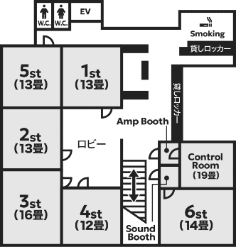 ライブハウスの多いアメ村からも近く、ライブ前のバンド練習、リハーサルにも最適。
