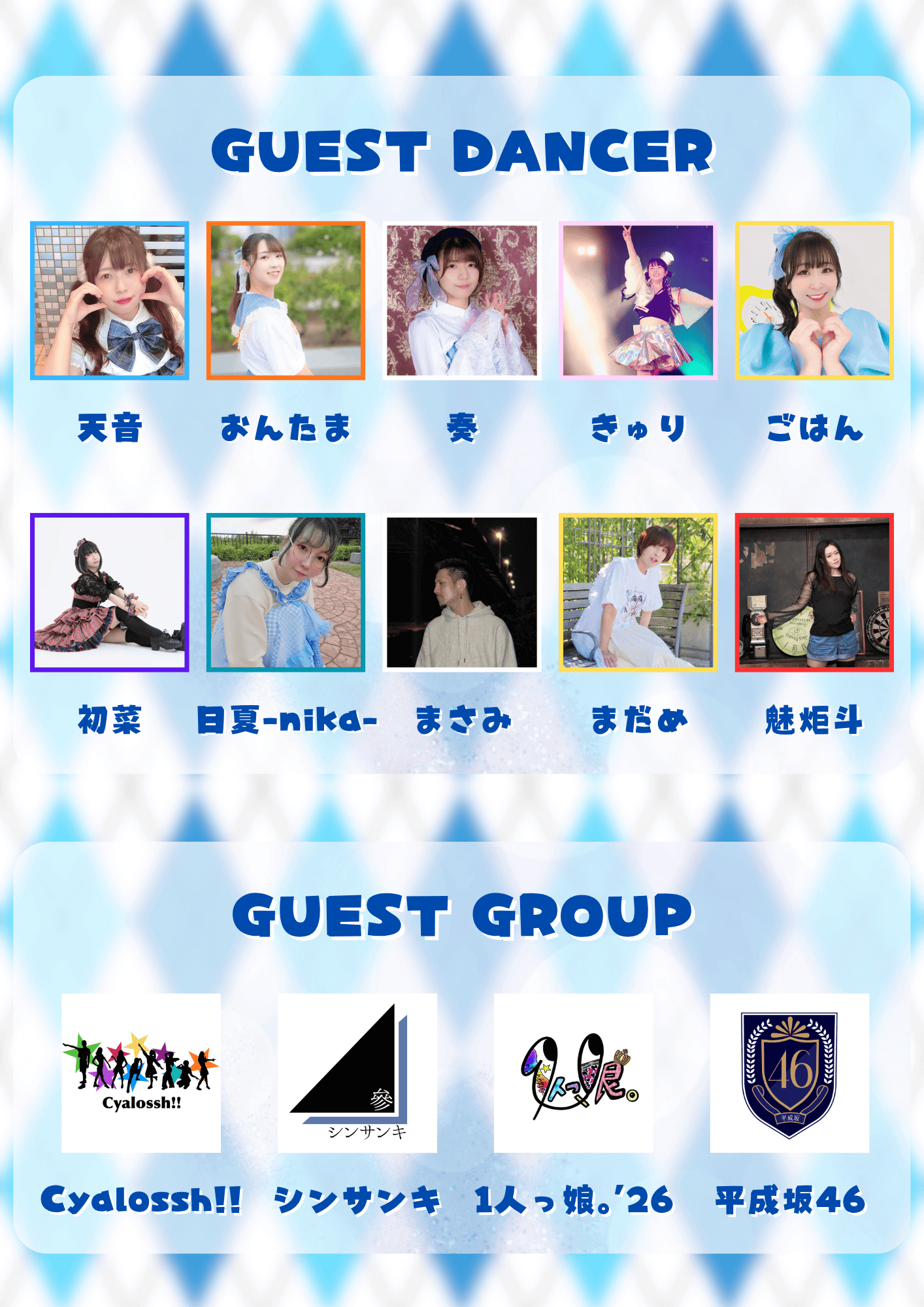 りょーま / 天音 / おんたま / 奏 / きゅり / ごはん / 初菜 / 日夏-nika- / まさみ / まだめ / 魅炬斗 / Cyalossh!! / シンサンキ / 1人っ娘。'26 / 平成坂46