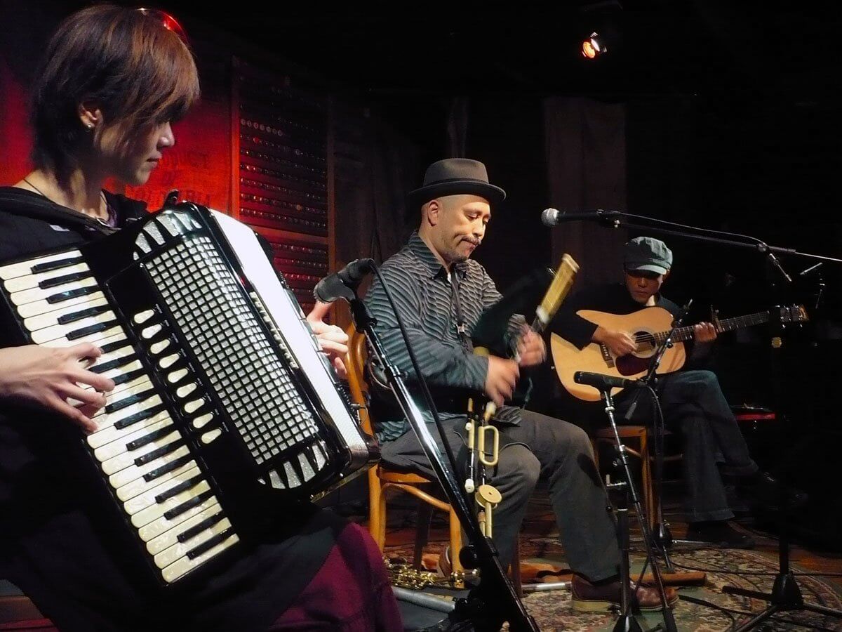 古式の製鉄に用いられる鞴(ふいご)を使った火おこしの装置のことです。 鞴の風が唸り、鉄が鍛えられる。 かつて時代の最先端であった鞴座はバグパイプやアコーディオンなどの鞴楽器と 鉄弦ギターを用いた新しい音楽のスタイルとなって現代に甦りました。 2004年春結成。 鞴座の音楽 アイリッシュ・ケルトやフランスのミュゼット クレズマーやロマなどのヨーロッパの大衆音楽を基調とし そこに様々な要素とジャパニーズ・テイストを加味した 全く新しい、それでいてどこか懐かしいサウンドです。